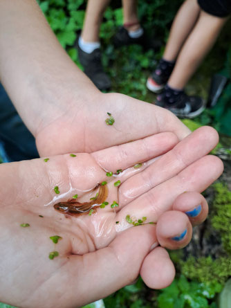 Molchlarven wie diese sehen fast aus wie kleine Drachen und fressen Gelsenlarven. Gemeinsam mit "Wasserbienen" (Rückenschwimmer) und anderen Nützlingen halten sie unsere Hochwasser- und