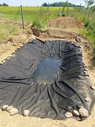 Allerdings haben wir auch zwei Teiche mit langlebiger UV-beständiger Folie bzw. Kautschuk ohne Weichmacher als eiserne Reserve für Dürren zum Gießen der benachbarten Obstbäume. Dieser Teich wird
